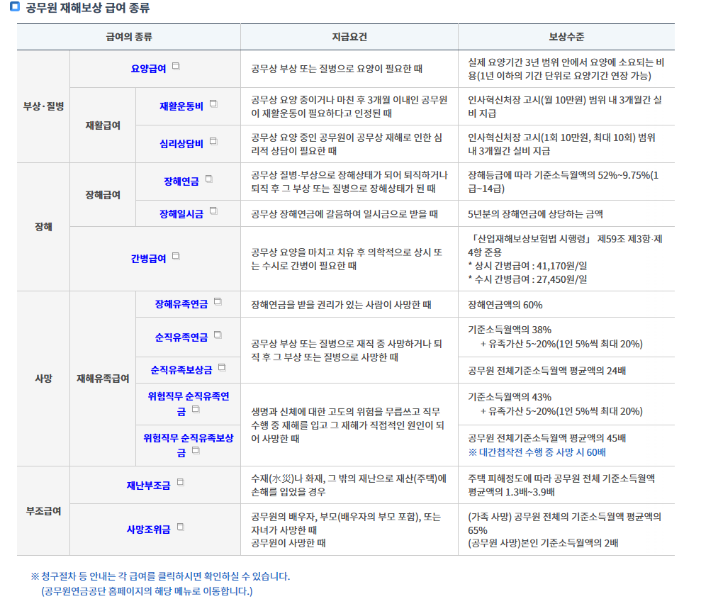 공무상 재해로 인정되면 상황에 따라 다양한 급여와 지원이 이뤄집니다.