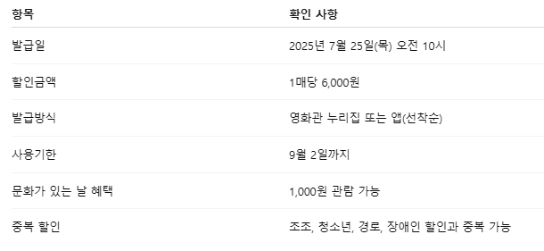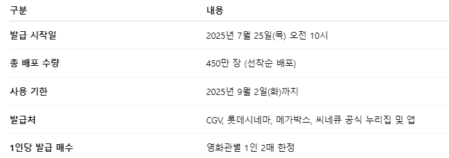 이번 정책은 7월 25일(목) 오전 10시부터 전국 영화관에서 사용할 수 있는 6,000원 할인권 총 450만 장을 배포하는 대규모 지원 사업입니다.