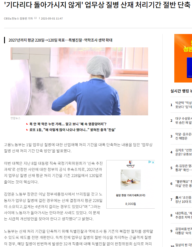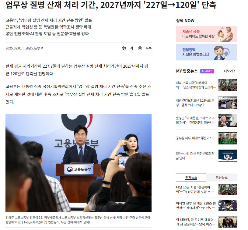 이에 따라 고용노동부는 대통령 직속 국정기획위원회에서 제시한 '업무상 질병 처리 기간 단축' 과제를 신속 추진하기 위해, 2025년 9월 1일 '업무상 질병 산재 처리 기간 단축 방안'을 공식 발표했습니다.